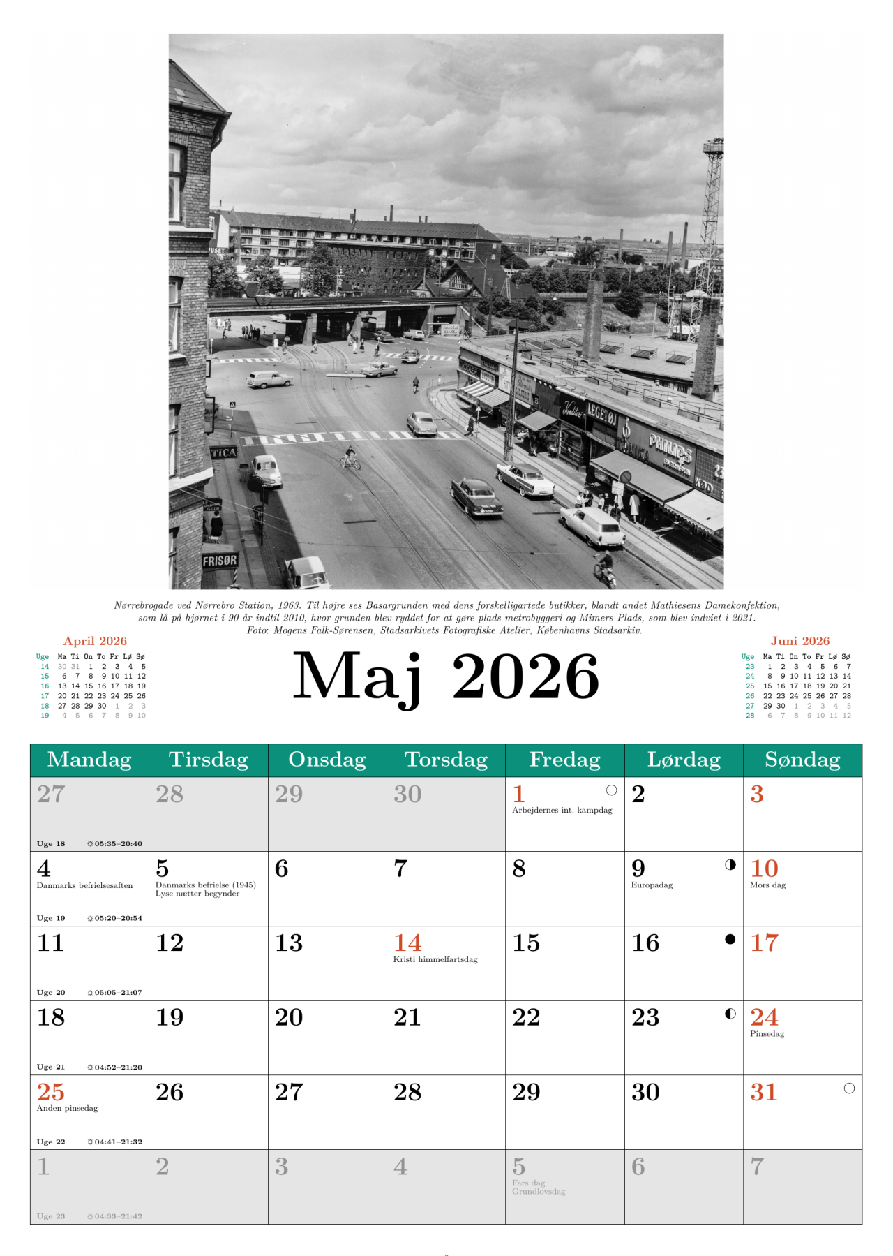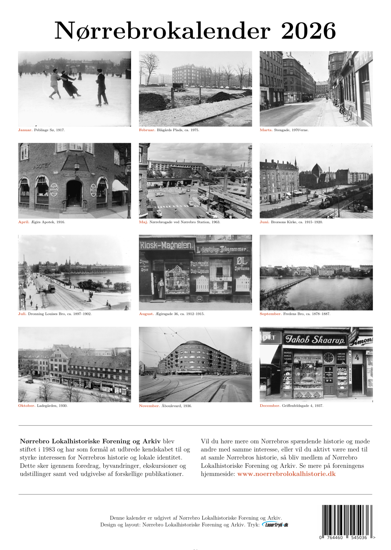 Nørrebrokalender 2026 fra Nørrebro Lokalhistoriske Forening og Arkiv er en hængekalender i A3-format, som indeholder 12 specielt udvalgte billeder fra det lokalhistoriske Nørrebro med tilhørende billedtekster. Forsidefotoet på årets kalender giver et indtryk af eftermiddagstrafikken på Dronning Louises Bro set mod Indre By for over 125 år siden. Blandt de øvrige billeder finder man fotografier af en kiosk ved navn Magnet-Kiosken og en gade og en bro, som slet ikke ligner sig selv i dag – Stengade og Fredens Bro – sammenlignet med for henholdsvis 50 og 150 år siden.